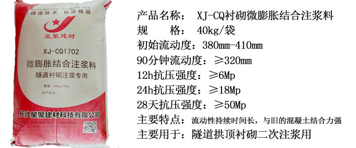 微膨胀结合注浆料是针对隧道衬砌拱顶脱空等质量通病研发的一种新型缓凝型早强注浆料,由多种超细高分子有机和无机材料与超细掺合料、优质硅酸盐水泥和硅砂等经特定工艺加工而成,产品具有加水搅拌即用,流动性大、缓凝和早强双重功效、与混凝土结合力好、微膨胀等特性,技术指标完全满足《隧道衬砌拱顶带模注浆技术要求》。广泛用于隧道拱顶带模注浆、隧道拱顶脱空注浆回填、地铁管片安装后间隙注浆。